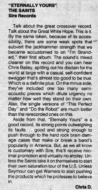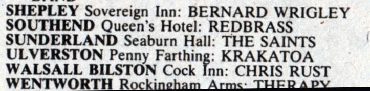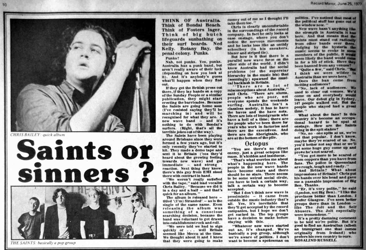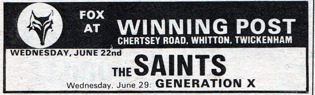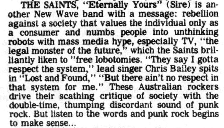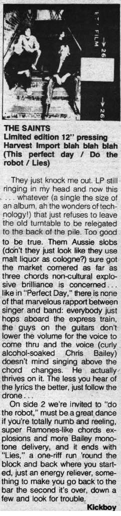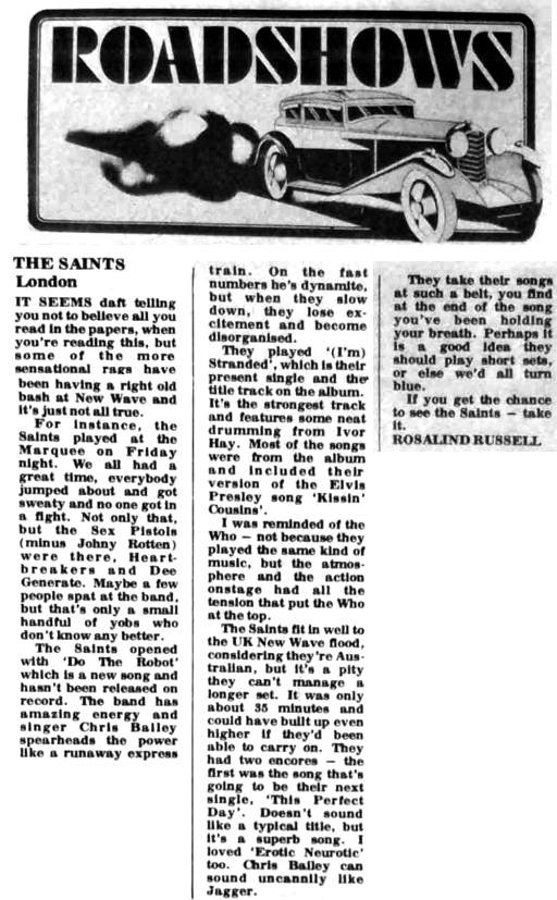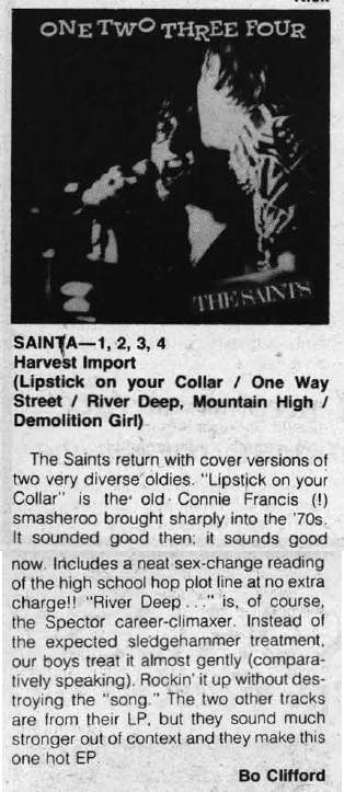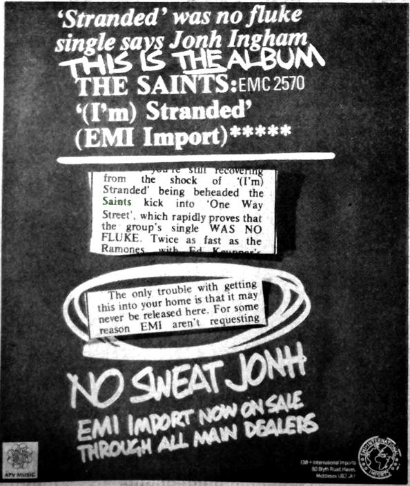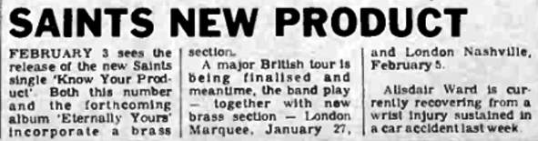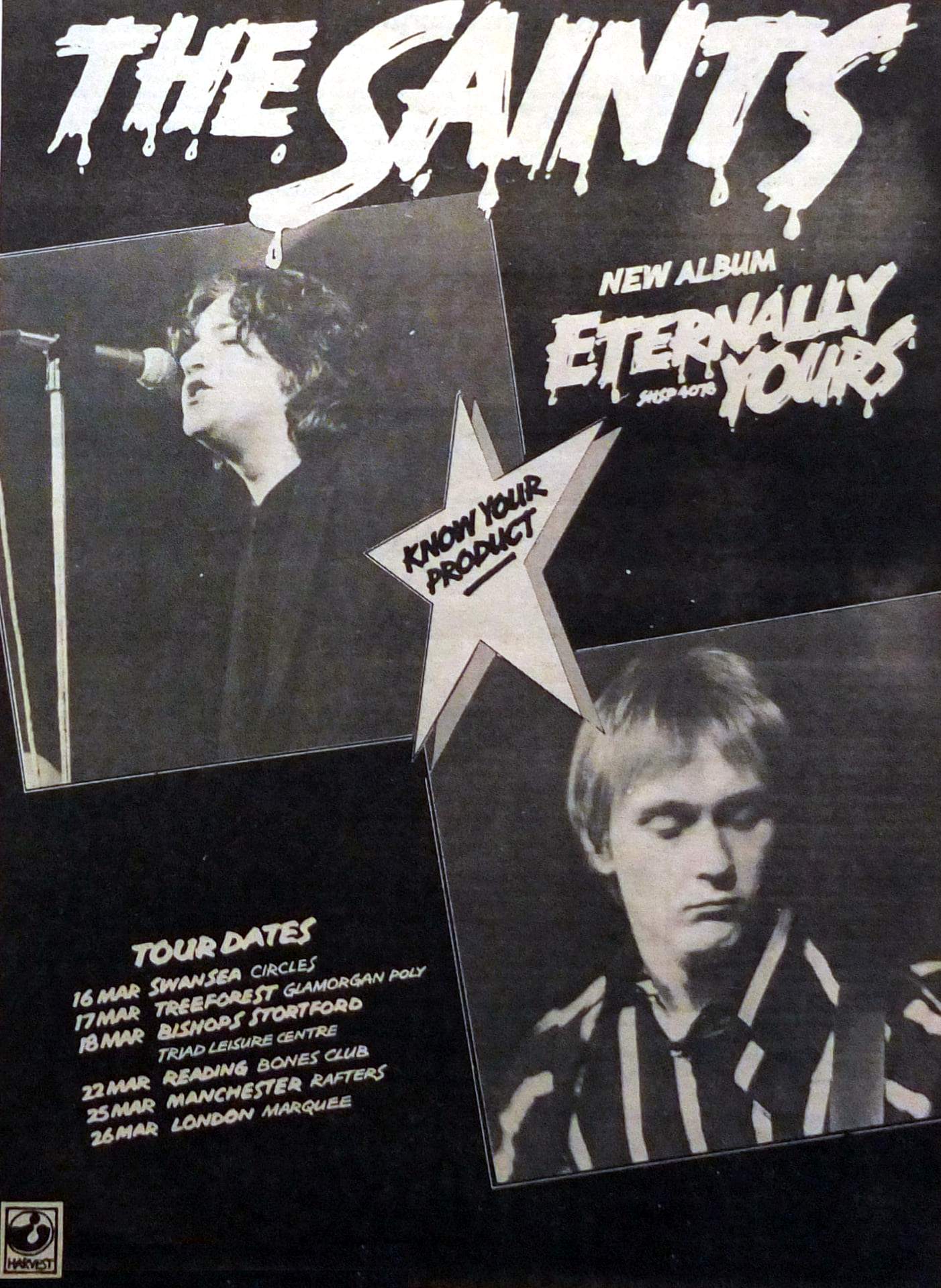 Note 1: "After a couple of months we decided to make another go of it, as the Saints. This time, Ivor changed to drums and we got another bass player and played our first really successful dance. It was on New Year's Eve around a swimming pool and the audience was great." Ed Kuepper in Sniffin' Glue #4 - Punk zine, October 1976.
