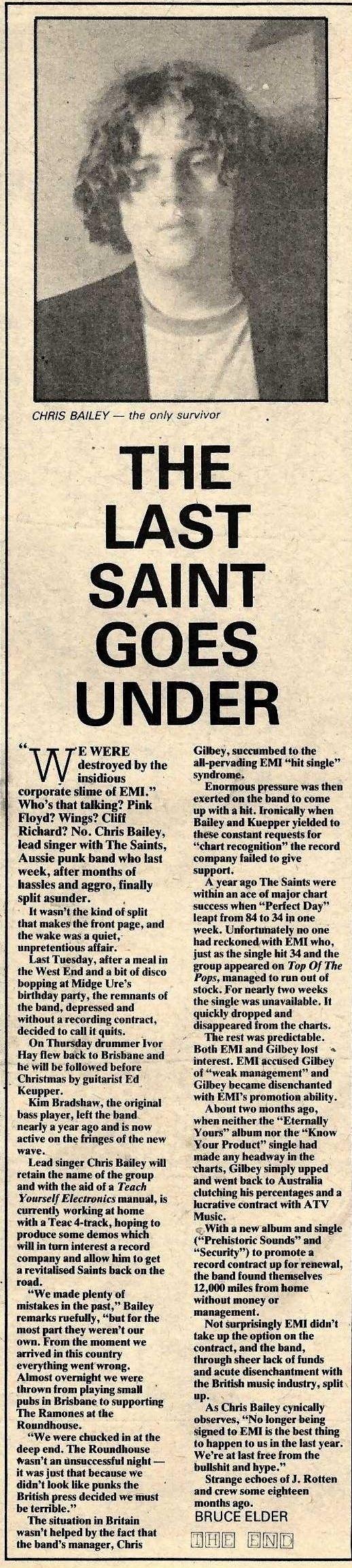 Bailey retains the name The Saints, Kuepper returns to Brisbane before Christmas and forms The Laughing Clowns, Alisdair Ward remains in the UK joining The Damned and Ivor Hay returns to Brisbane on 19-Oct-78 and forms The Hitmen.