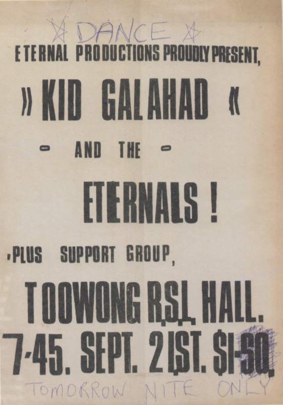 Kid Galahad and the Eternals Line-up #2 (Brisbane: Late 1974): Chris Bailey (vocals)/ Ed Kuepper (guitar)/ Ivor Hay (keyboards/bass) and John Sawyer (drums).