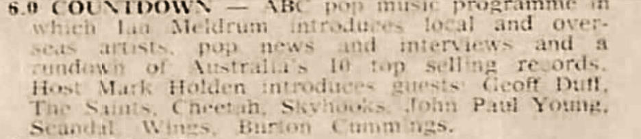 Note : Recording date. "Countdown", was a national weekly music show, hosted by Ian 'Molly' Meldrum, which aired on Sundays from 08-Nov-74 to 19-Jul-87.