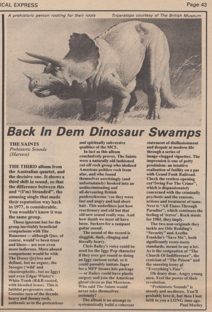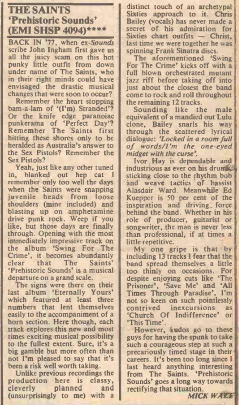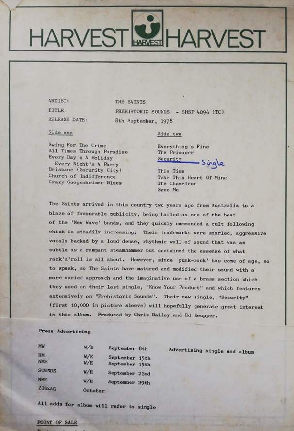 Apr/May-78 UK London-Highbury,Wessex Studios,recording/mixing the "Prehistoric Sounds" album. Engineered by Bill Price, with Jeremy Spencer Green. Produced by Ed Kuepper and Chris Bailey. Additional brass players: Roger Cawkwell (sax), Paul Nieman (trombone), Martin Bruce (trumpet) and Martin Dover (trumpet).