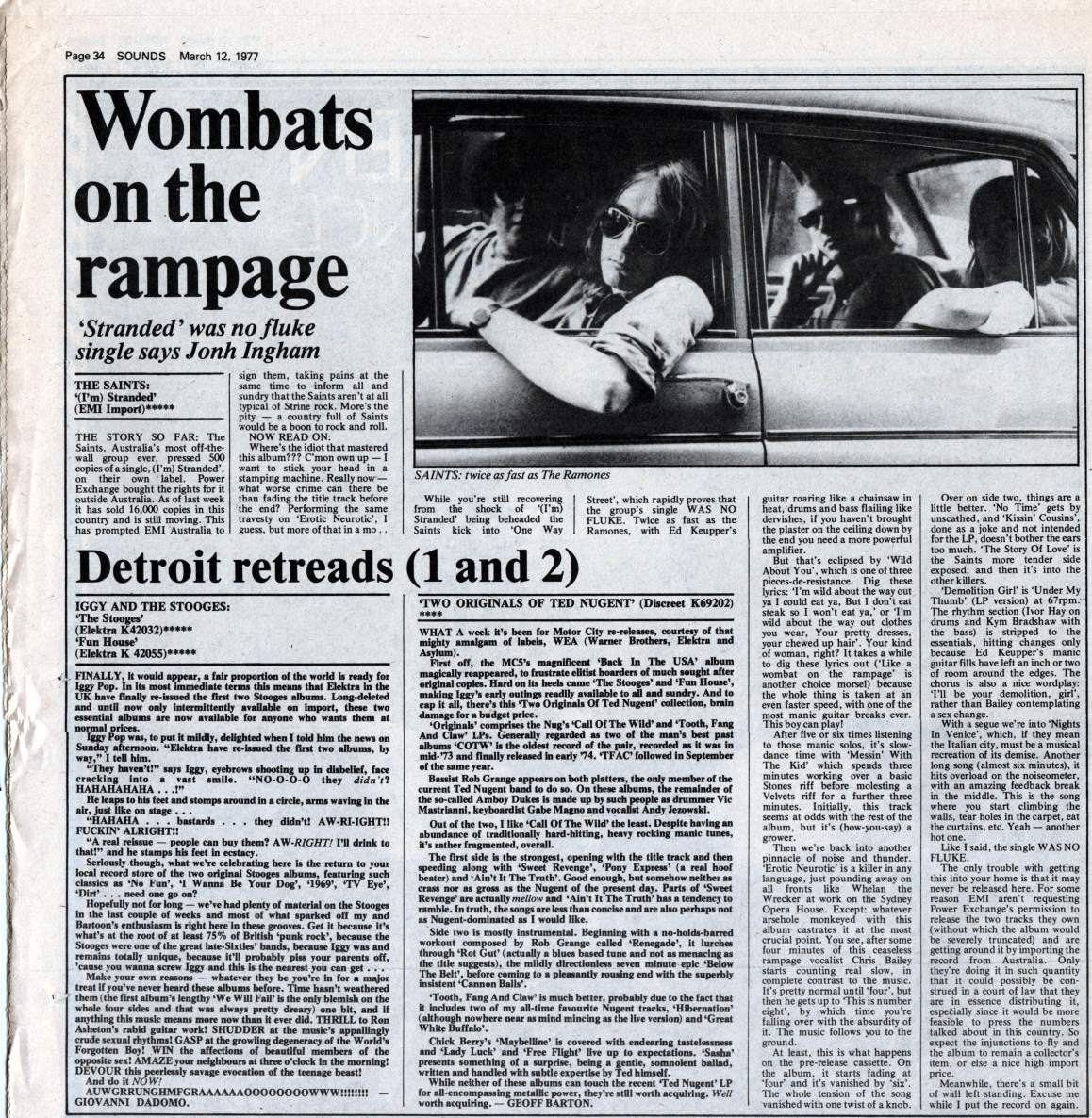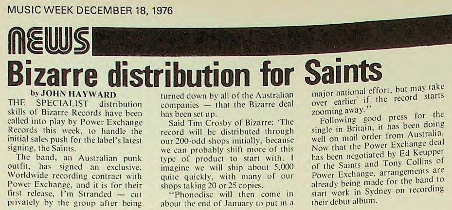 Note 1: "When [Rod Coe] was sent by EMI to Brisbane for two days in late 1976 to record and sign a young local band called The Saints, he had no idea he was about to produce one of the all-time iconic Australian albums. "The band weren't really interested in knowing about me," he says. "They were surly, they didn't want to know about anything much. They just wanted to get on with it. They were hard to communicate with. So it was a confronting situation, but once they started playing it was compelling." [..] Coe describes feeling pretty far out of his comfort zone recording The Saints in a demo studio in Brisbane with an inexperienced engineer and rudimentary gear. [...]"Ivor's drums were just an ordinary old kit, nothing was tuned very well. Ed had a nice old Gibson SG but he was playing through an old column PA that was cranked. [...] This sheeting guitar sound was just astonishing. It was through everything, you couldn't get rid of it. It bled into the drums, it bled into the bass, it certainly bled into the vocals. But there was something about it that was just right. I'm quite grateful now when I think back that we didn't actually take them to record at EMI in Sydney. We would have cleaned it up far too much.". from 40 years of punk: The surprising Slim Dusty connection to The Saints' (I'm) Stranded by Alice Keath for Radio National ABC News, 29-Aug-16.